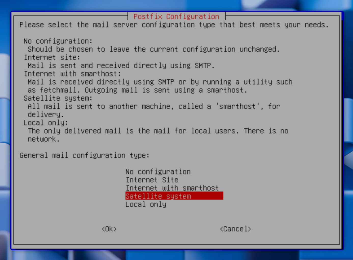 Un wizard de configuration vous demandera quel type d'installation choisir pour postfix: